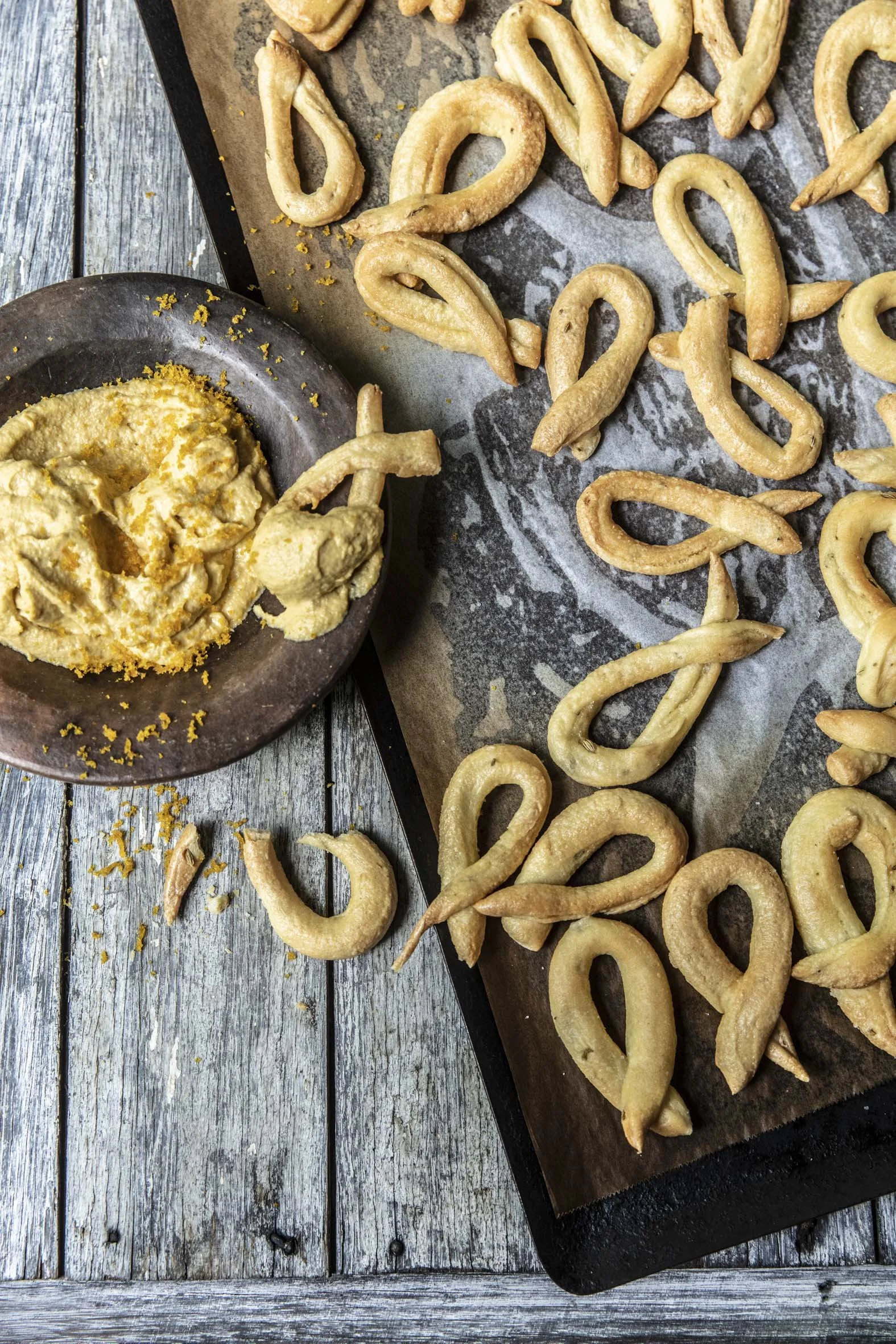Taralli are pretzel-like crackers that are enjoyed in the south of Italy. They tend to be flavoured with poppy seeds or fennel seeds or simply with salt and are served with wine. The whipped bottarga, a cured cod roe, is a perfect accompaniment as it’s salty and almost sweet at once. This recipe uses colatura, an anchovy sauce that’s an Italian equivalent of the fish sauce found in Asian cooking. If you can’t find any, you can replace it with an anchovy instead.