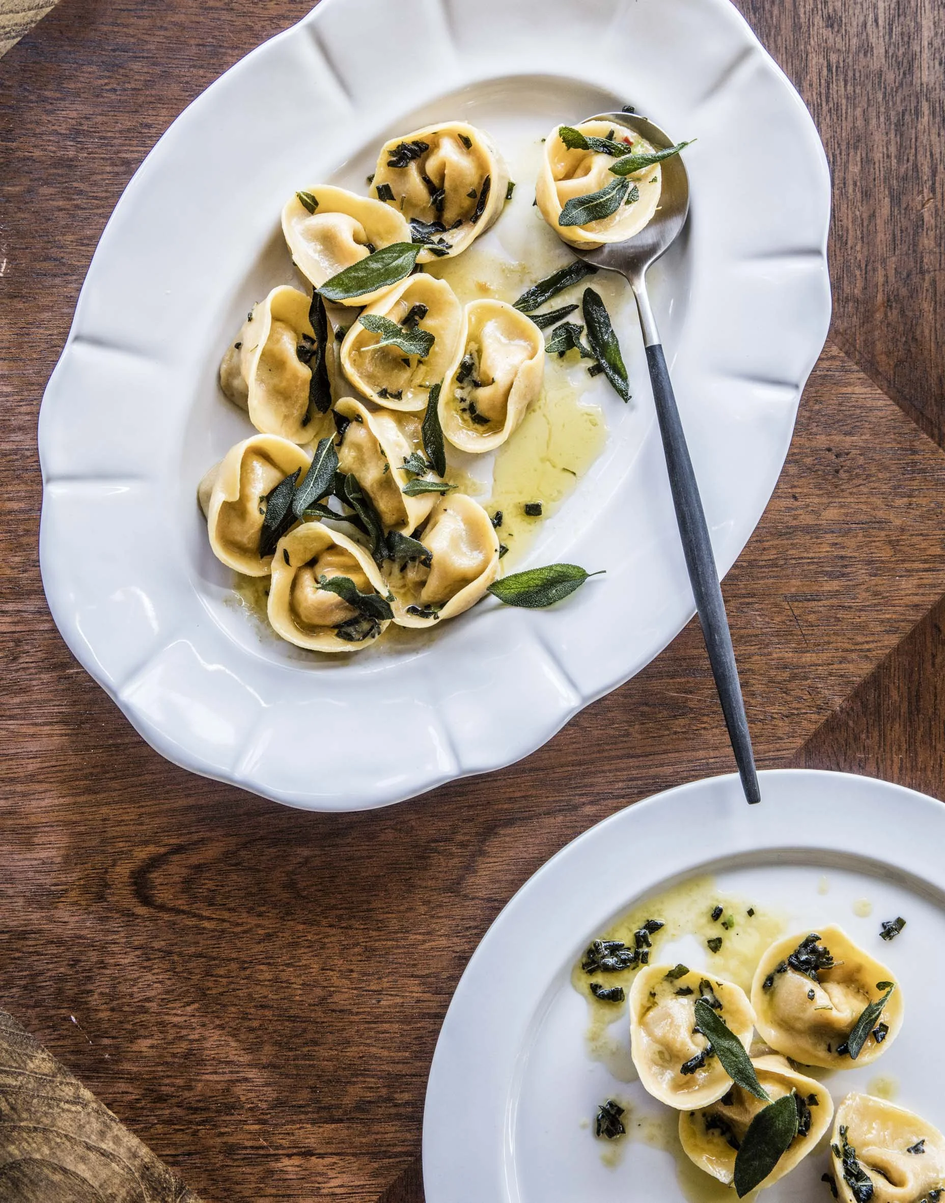 To me, pumpkin, Parmigiano and sage butter all scream Emilia-Romagna, the home of classically filled pastas such as tortellini, tortelli and ravioli. This dish has a savoury sweetness to it that I have found no one ever dislikes, and the satisfaction of rolling your own tortellini is hard to beat. Whenever I make a batch at home I always make extra and freeze them for a quick dinner another time. They cook beautifully from frozen – just pop them straight into boiling water until al dente.